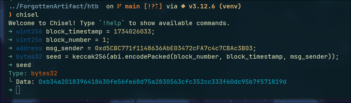 Note that, the from parameter in this transaction, won’t be the actual msg.sender used to calculate the hash in the ForgottenArtifact contract, because the Setup contracts is responsible to deploy the challenge contract and therefore the constructor will see the address of Setup as the actual msg.sender. The setup contract address can be easily retrieved using the TCP challenge handler: